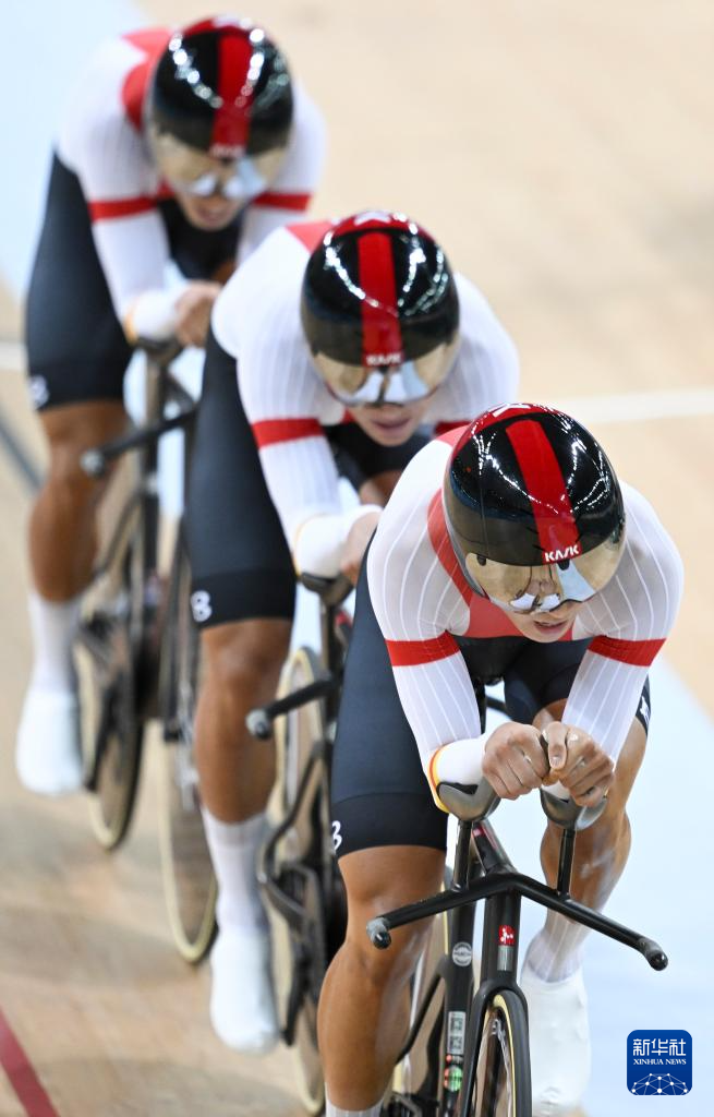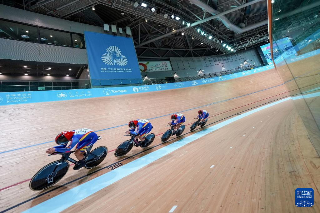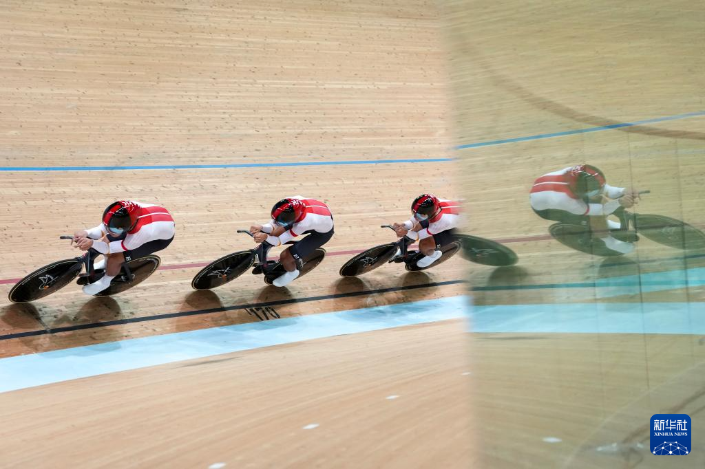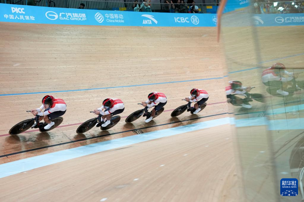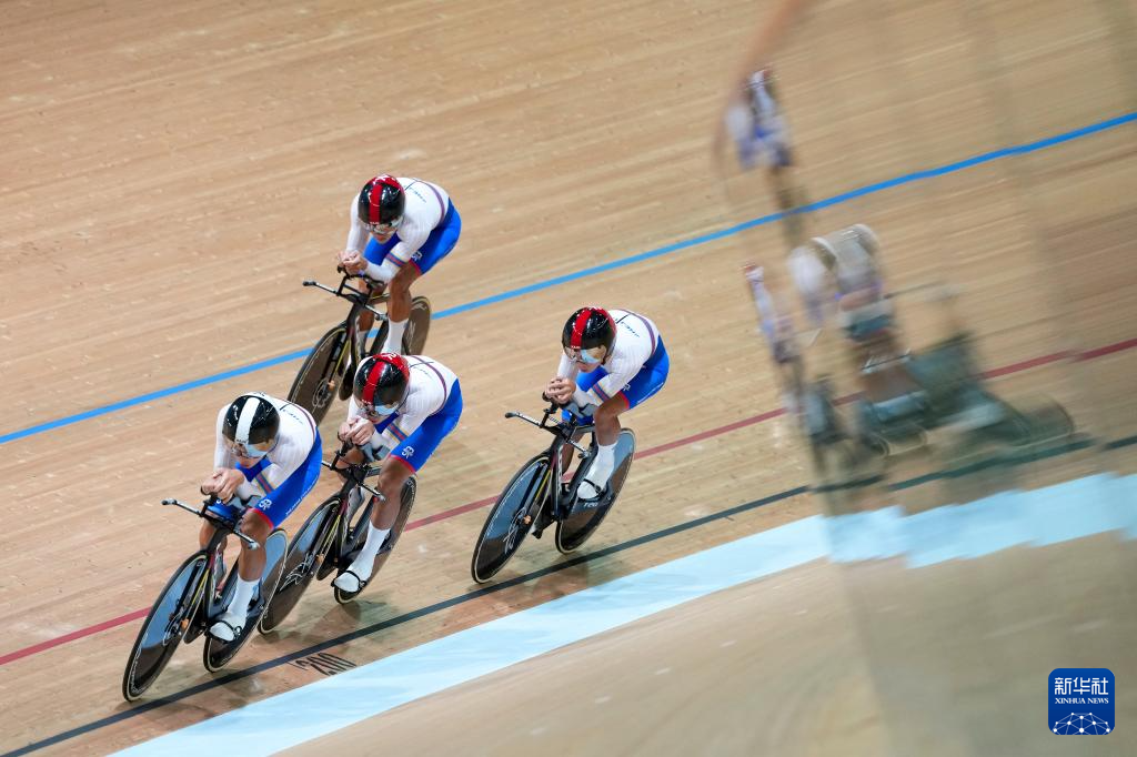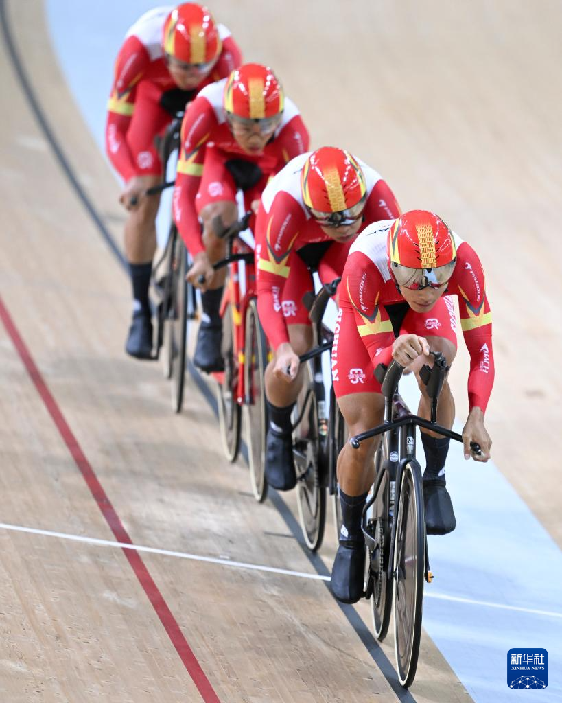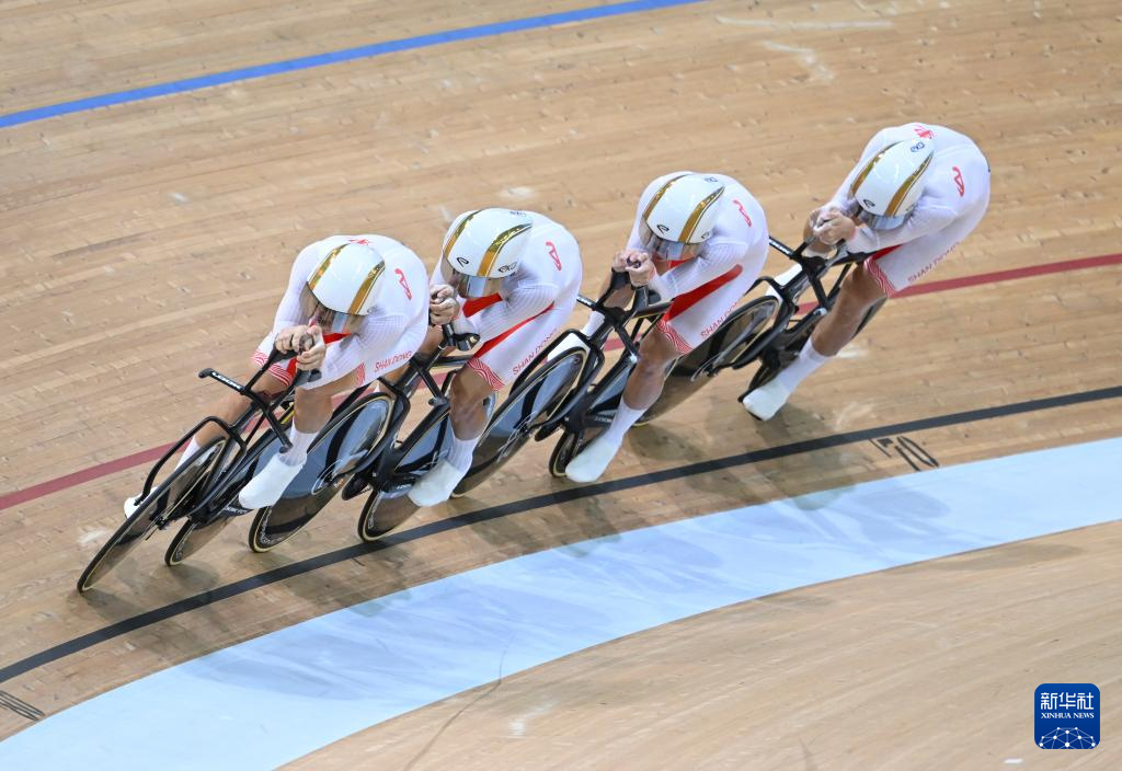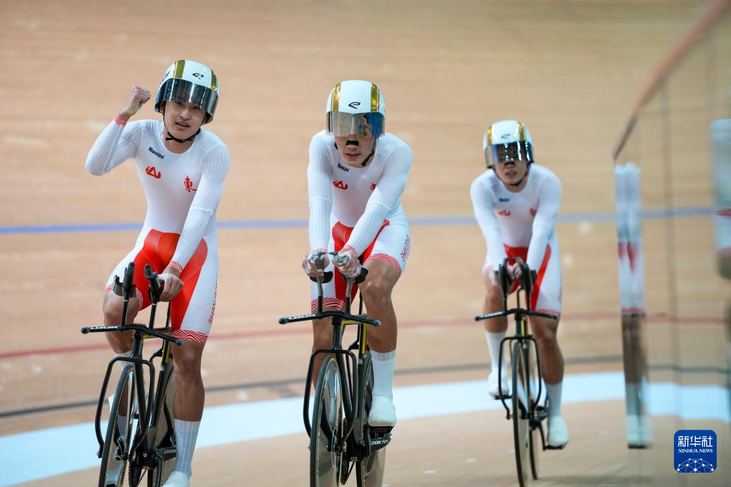 当日,第十五届全国运动会场地自行车男子团体追逐赛决赛在香港举行。
