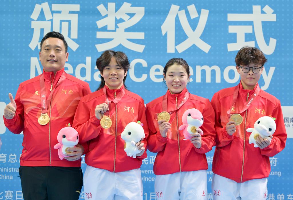 11月13日,冠军河南队选手鲍珊菊(左二)、郭裕芳(右二)、骆书艳(右一)和教练在颁奖仪式上合影。新华社记者 胡虎虎 摄
