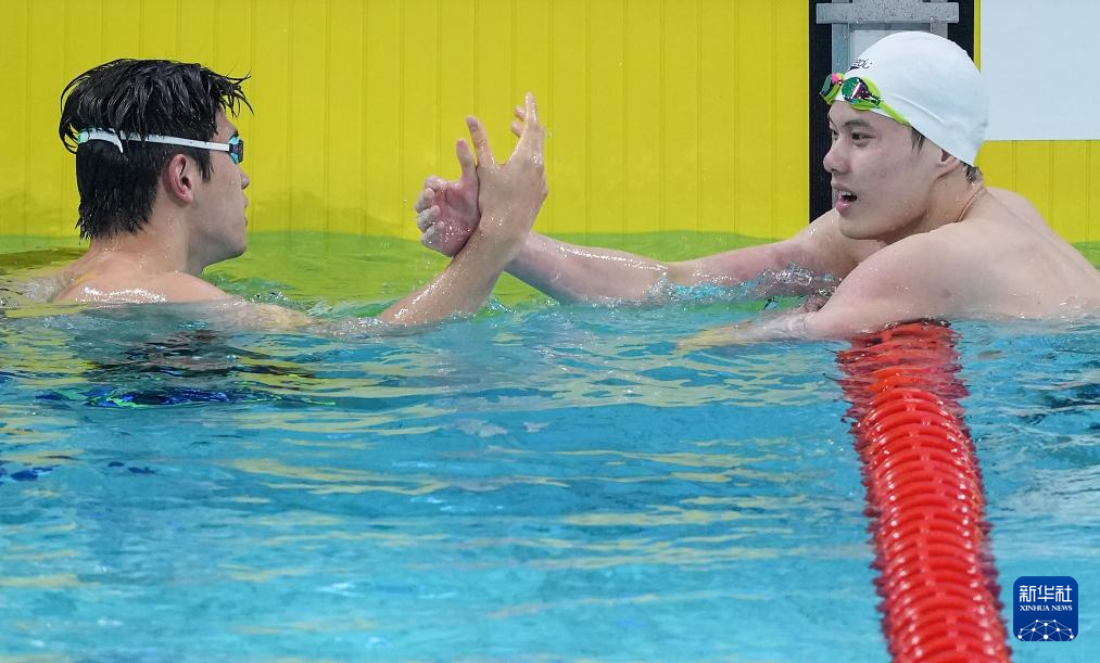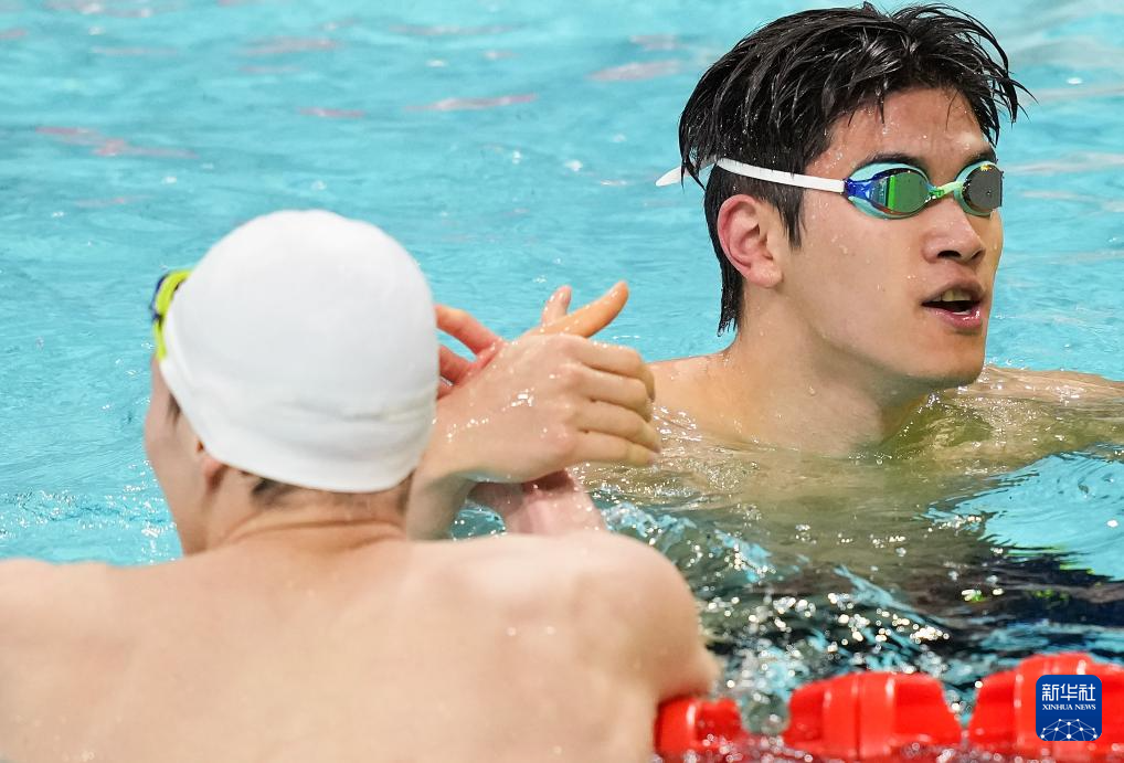 11月14日,浙江队选手潘展乐(右)与江苏队选手赵家悦在赛后握手致意。他们分别获得冠军、季军。