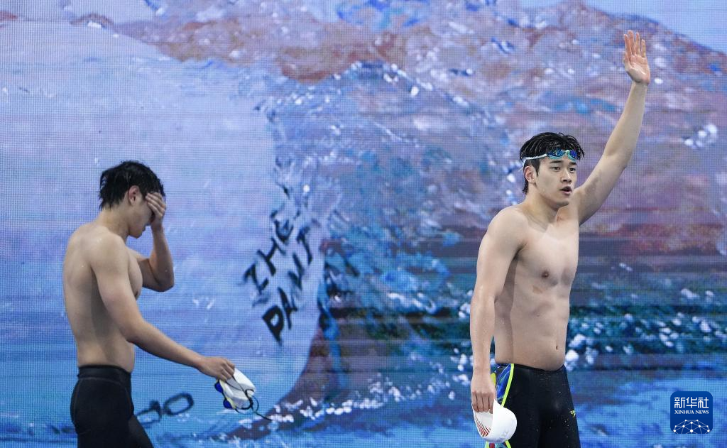 11月14日,浙江队选手潘展乐(右)在比赛后向观众致意。他获得冠军。
