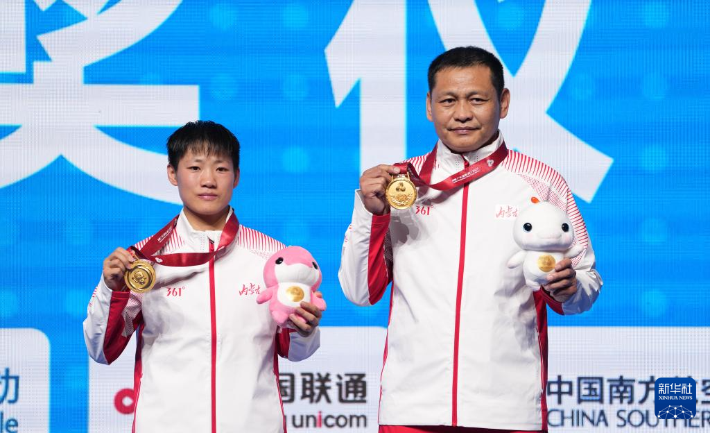 11月14日,冠军内蒙古队选手赵轩(左)与她的教练员在颁奖仪式上合影。
