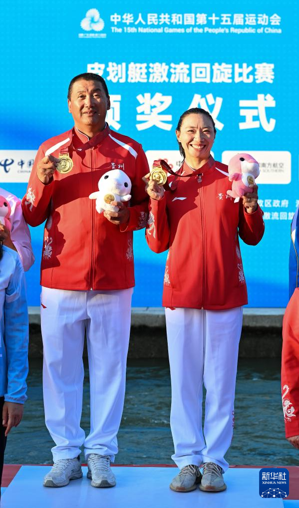 11月15日,冠军贵州队选手晏佳华(右)与教练员在颁奖仪式上。