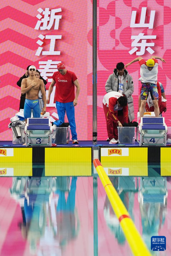11月15日,浙江队选手费立纬、孙杨、潘展乐和汪顺(从右至左)在比赛中出场。