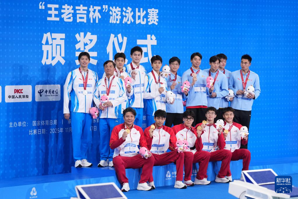 11月15日,浙江队选手汪顺、费立纬、孙杨和潘展乐(从左至右)在比赛后。浙江队获得亚军。