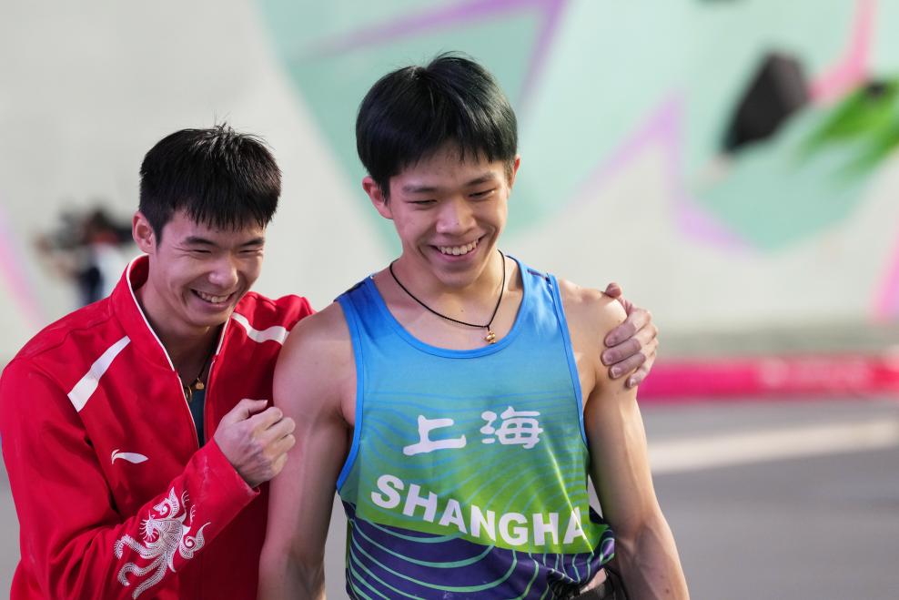 11月14日,上海队选手赵一程(右)在男子速度金牌决赛夺冠后。新华社记者 赖向东 摄