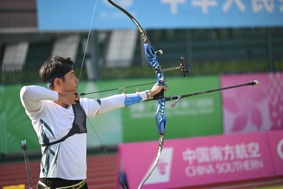 11月14日,澳门选手黎城杰在十五运会射箭项目男子反曲弓个人排名赛比赛中。新华社记者 张龙 摄