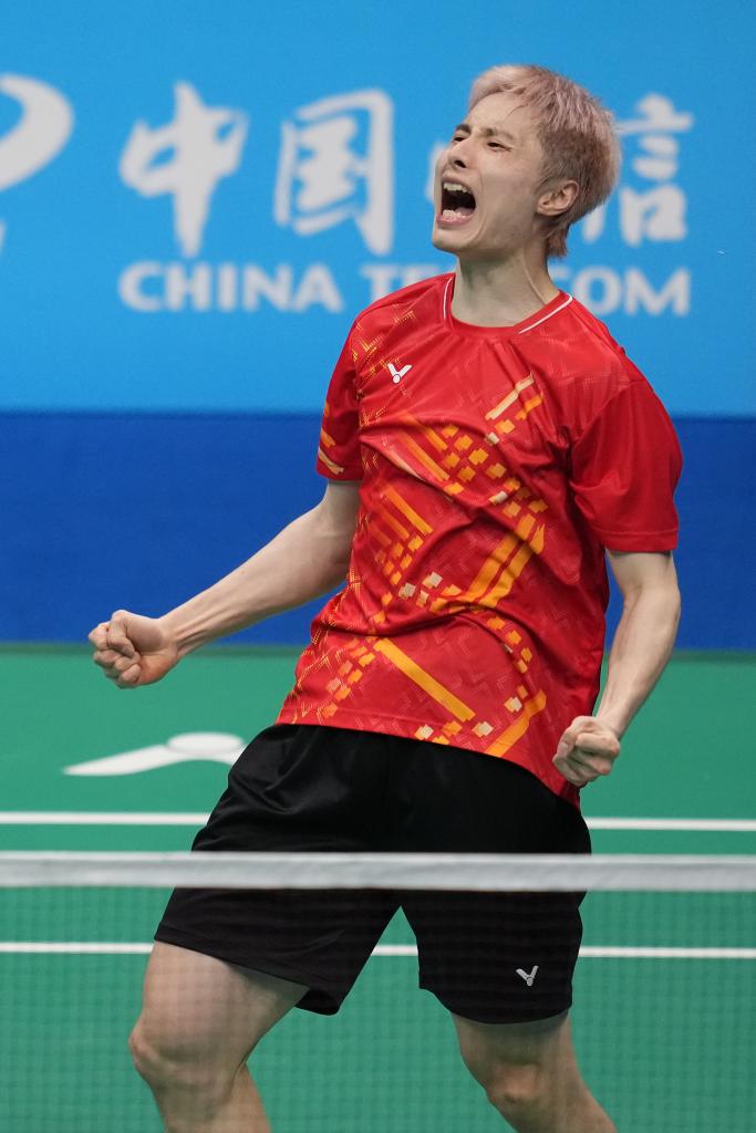 11月14日,江苏队选手石宇奇在男单比赛获胜后庆祝。新华社记者 陈思汗 摄