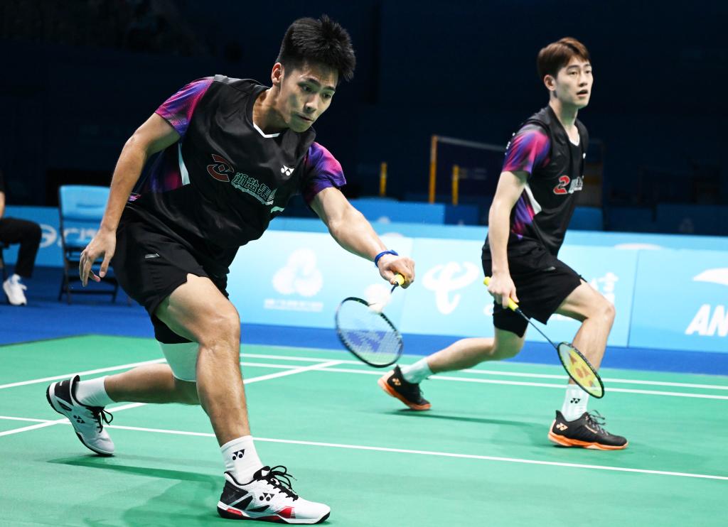 11月14日,浙江队组合王昶/谢浩南(左)在男双比赛中。新华社记者 李紫恒 摄