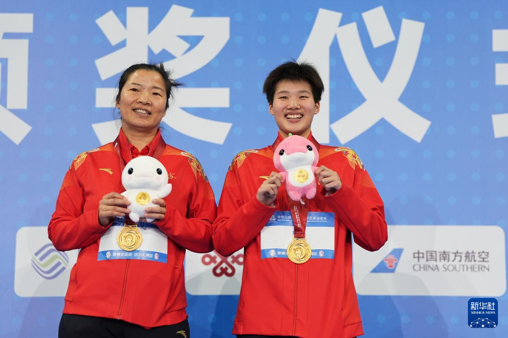 11月15日,冠军江苏队选手吕沁遥(右)和教练在颁奖仪式上。