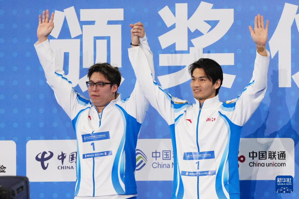 11月15日,冠军浙江队选手徐嘉余(右)和教练在颁奖仪式上。