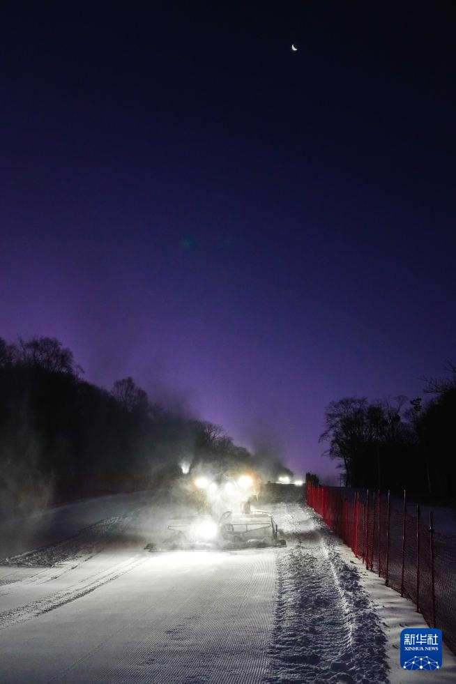 11月14日,在位于吉林市冰雪经济高质量发展试验区的北大湖滑雪度假区,压雪机在雪道上作业。