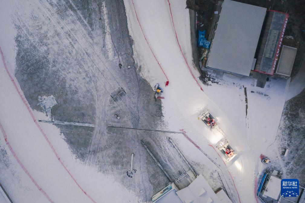 11月14日,在位于吉林市冰雪经济高质量发展试验区的北大湖滑雪度假区,压雪机在雪道上作业(无人机照片)。