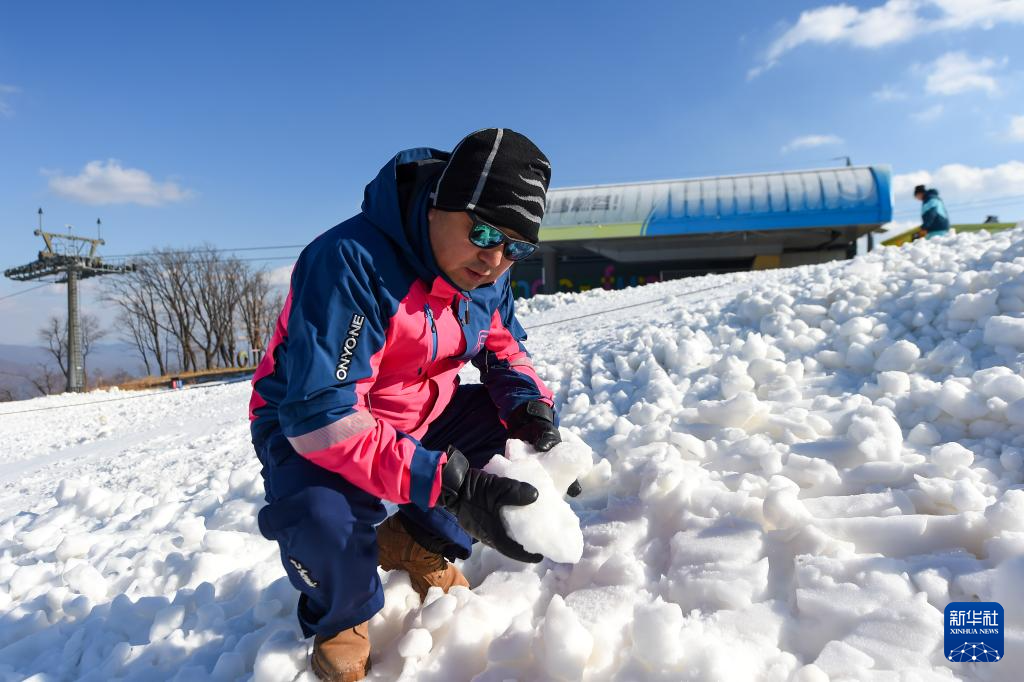 11月14日,在位于吉林市冰雪经济高质量发展试验区的北大湖滑雪度假区,工作人员平整缆车站闸机附近的雪面。