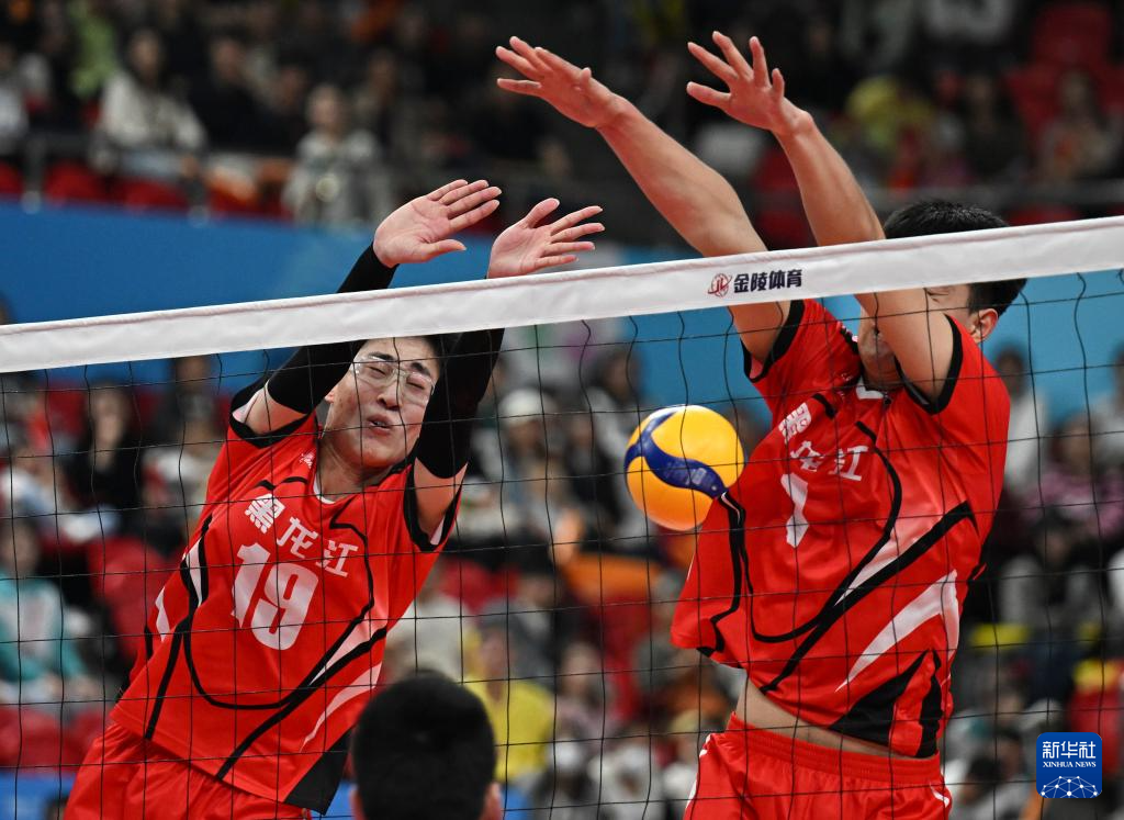 11月15日,黑龙江队球员赵子博(左)和刘国龙在比赛中拦网。