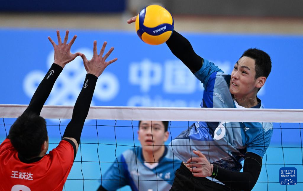 11月15日,江苏队球员仲其恒(右)在比赛中扣球。