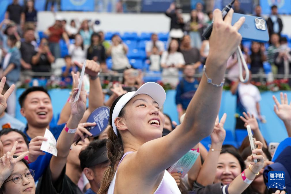 11月16日,广东队选手王欣瑜在比赛结束后与观众合影。