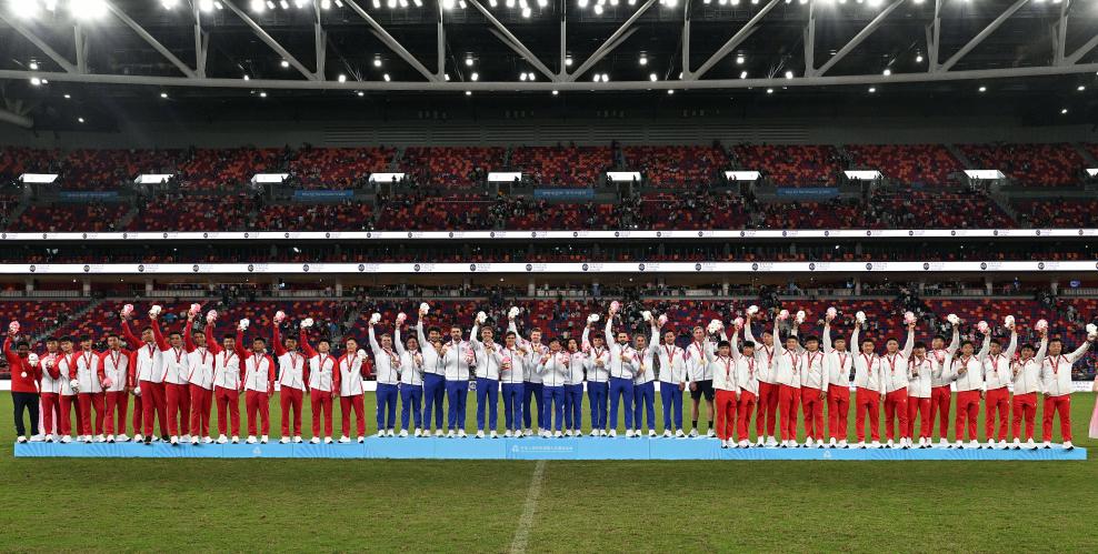 11月14日,第十五届全国运动会七人制橄榄球男子冠军香港队(中)、亚军山东队(左)、季军北京队(右)在颁奖仪式上合影。新华社记者 陈铎 摄