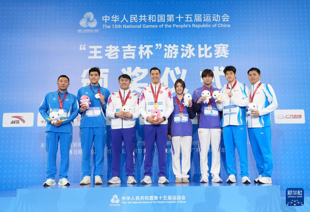 11月16日,获得冠军的香港队选手何甄陶(左四),获得亚军的辽宁队选手陈昊(左二),并列季军福建队选手刘吴狄(右三)、浙江队选手潘展乐(右二)在颁奖仪式上与教练合影。
