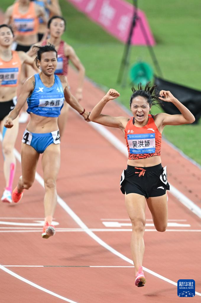 11月16日,云南队选手吴洪娇(右)在冲线后庆祝夺冠。