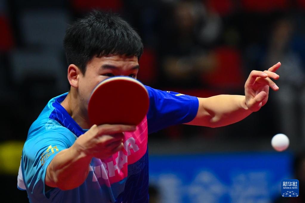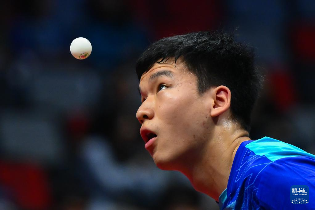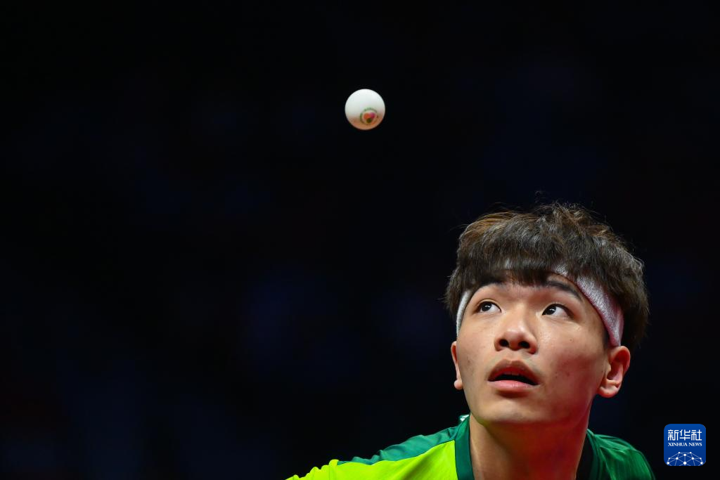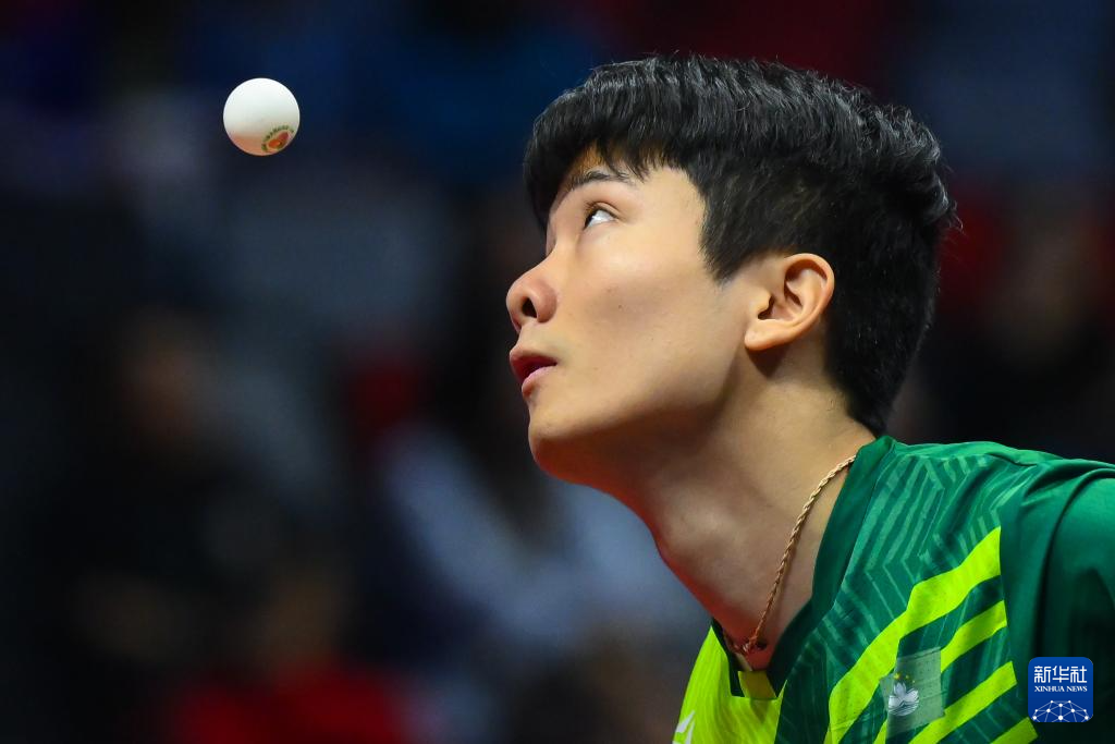11月16日,浙江队选手蔡伟在比赛中回球。他在单打比赛中3比0战胜澳门队选手陈梓贤。
