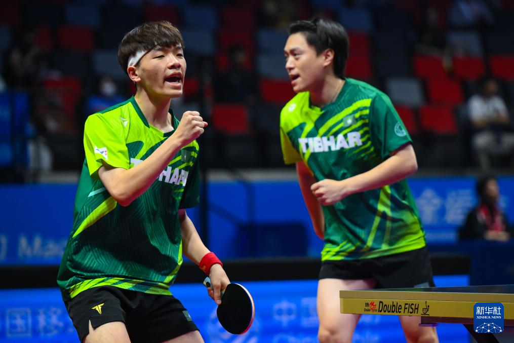 11月16日,澳门队组合王骏/陈梓贤(左)在比赛中庆祝得分。他们在双打比赛中0比3不敌浙江队组合孙正/蔡伟。