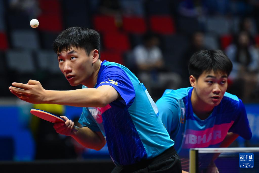 11月16日,浙江队组合孙正/蔡伟(左)在比赛中。他们在双打比赛中3比0战胜澳门队组合王骏/陈梓贤。