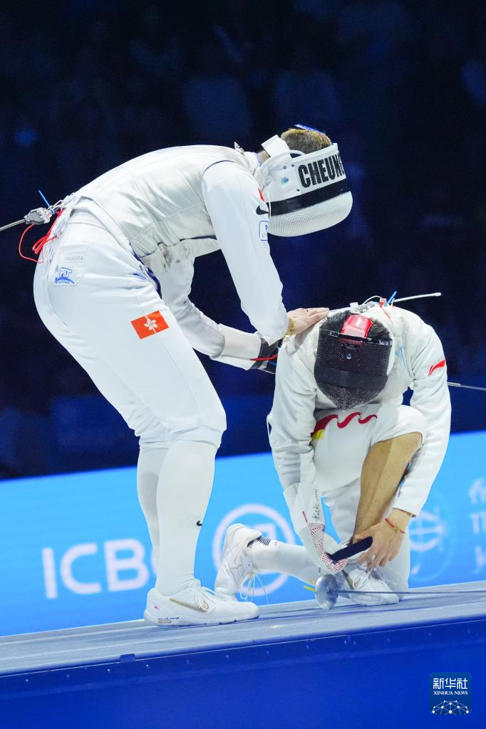 11月16日,香港队选手张家朗(左)查看个人选手曾昭然伤势。