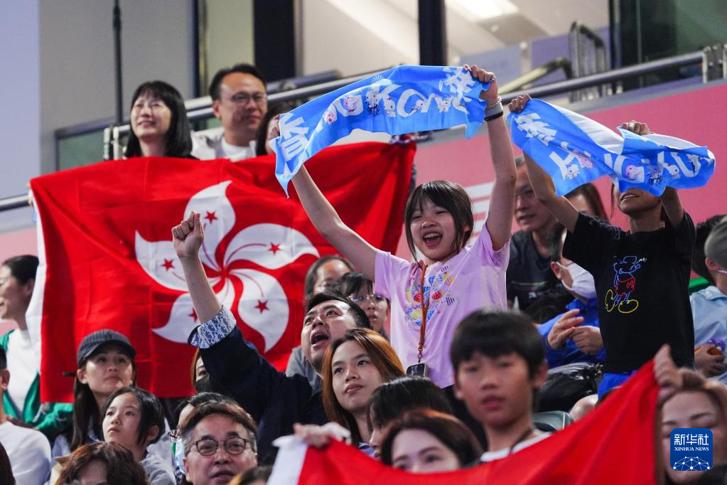 11月16日,香港队选手张家朗(左)在比赛中庆祝得分。