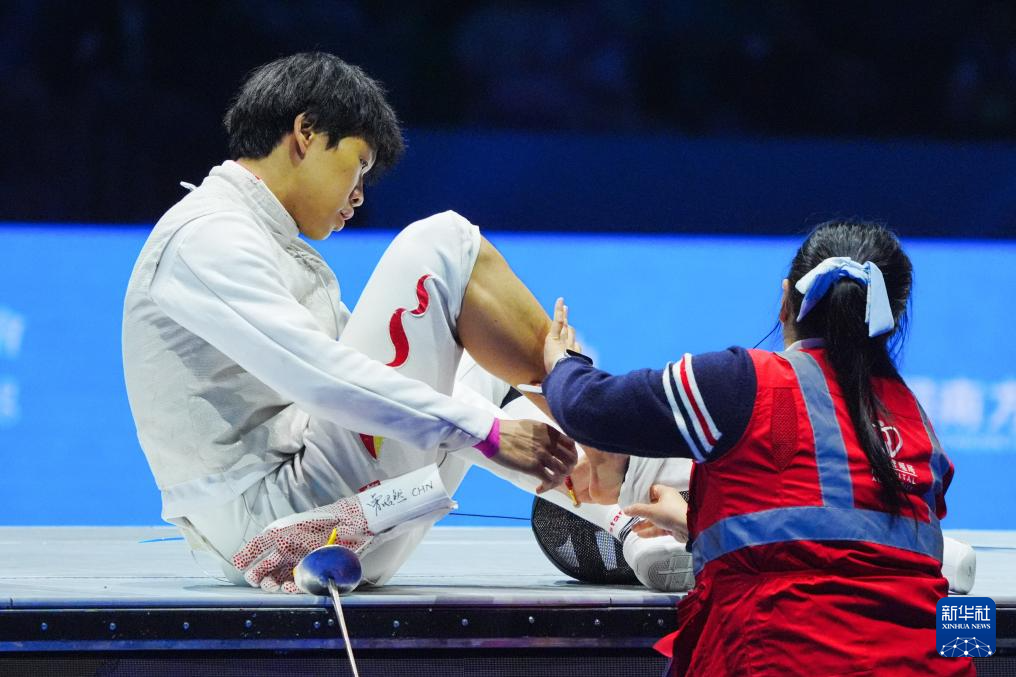 11月16日,个人选手曾昭然(左)在比赛中接受治疗。