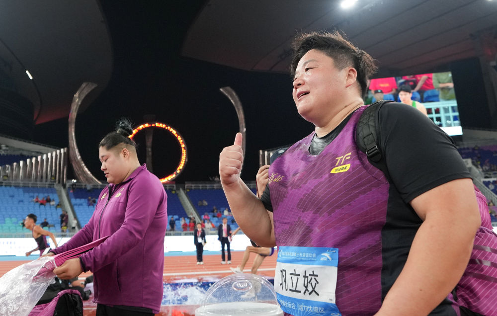 巩立姣是东京奥运会冠军、两届世锦赛金牌得主。2009年首次参加全运会以来,她已蝉联五届全运会女子铅球冠军。16日晚结束最后一投后,她高举双臂欢呼,随后向全场鞠躬,并和铅球赛场的每一名裁判、工作人员握手,与对手逐一拥抱。