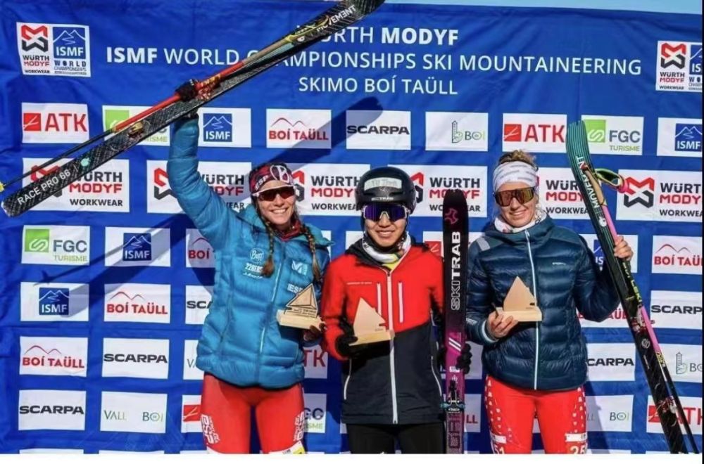 图为在西班牙加泰罗尼亚举行的2023滑雪登山世锦赛上,冠军中国运动员玉珍拉姆(中)在女子U20组短距离项目颁奖仪式上。新华社发