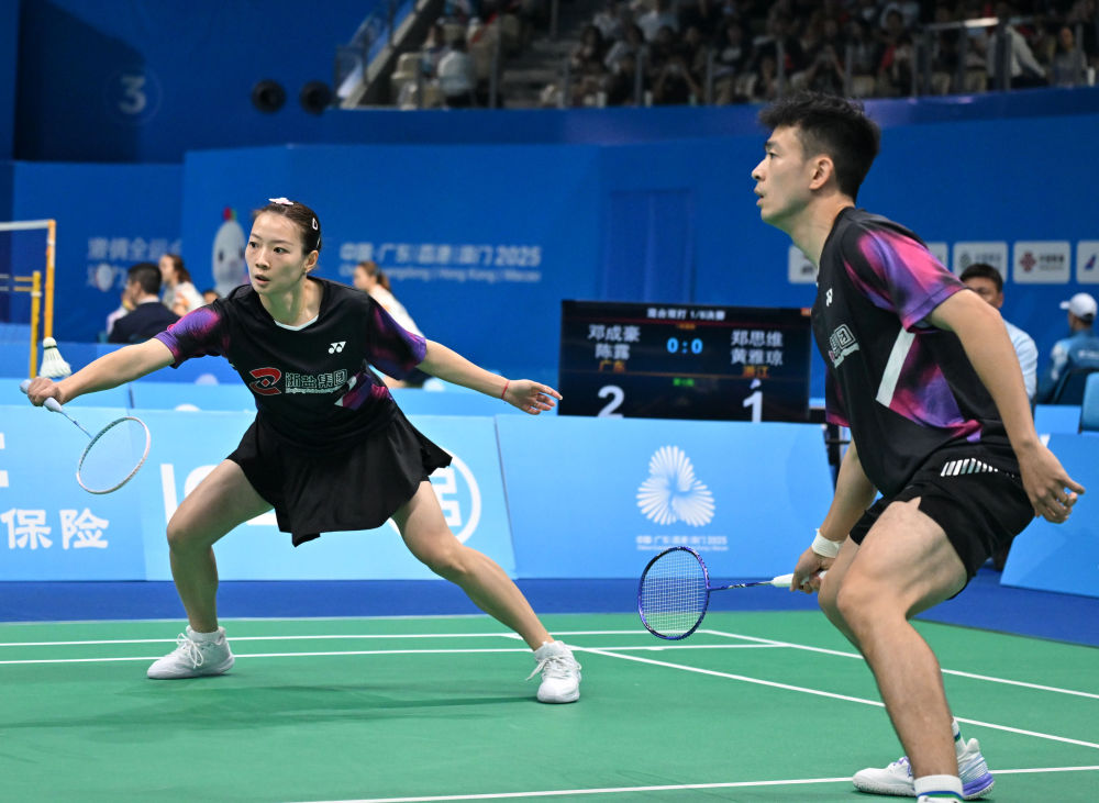 11月16日,浙江队组合郑思维/黄雅琼(左)在混双比赛中。新华社记者 李紫恒 摄