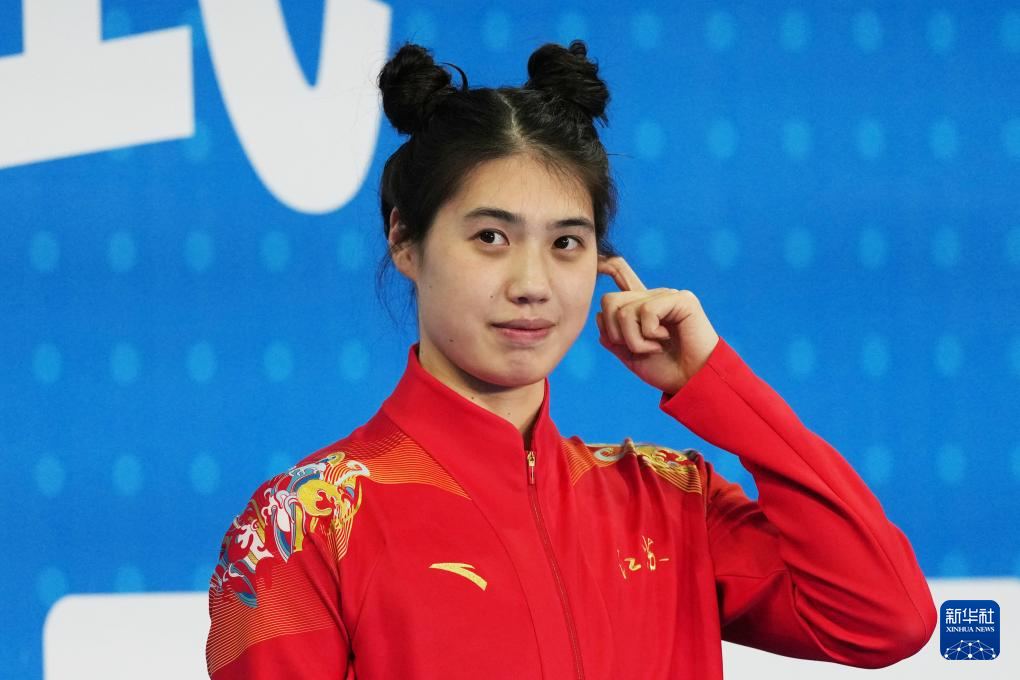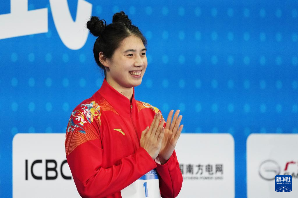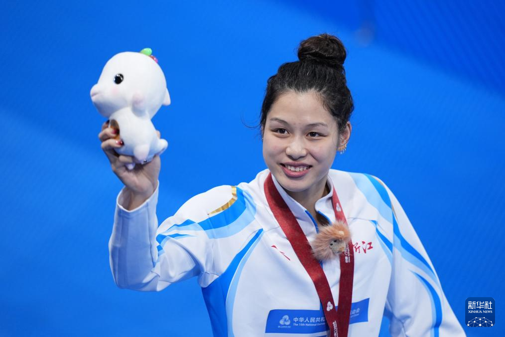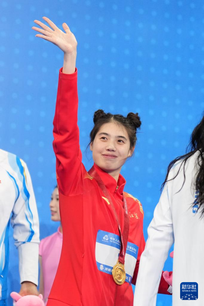 11月16日,获得冠军的江苏队选手张雨霏在颁奖仪式上挥手致意。
