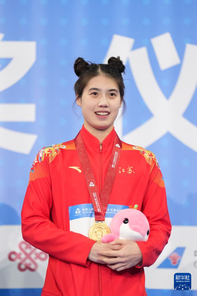 11月16日,获得冠军的江苏队选手张雨霏在颁奖仪式上。