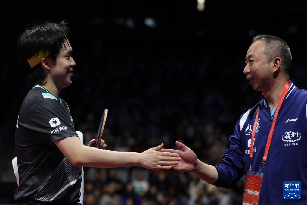 11月16日,北京队选手王楚钦(左)在赛后和教练击掌。