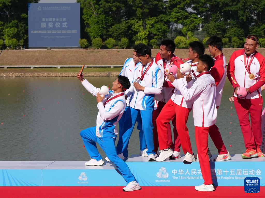 11月17日,获奖运动员和教练员在颁奖仪式上自拍。