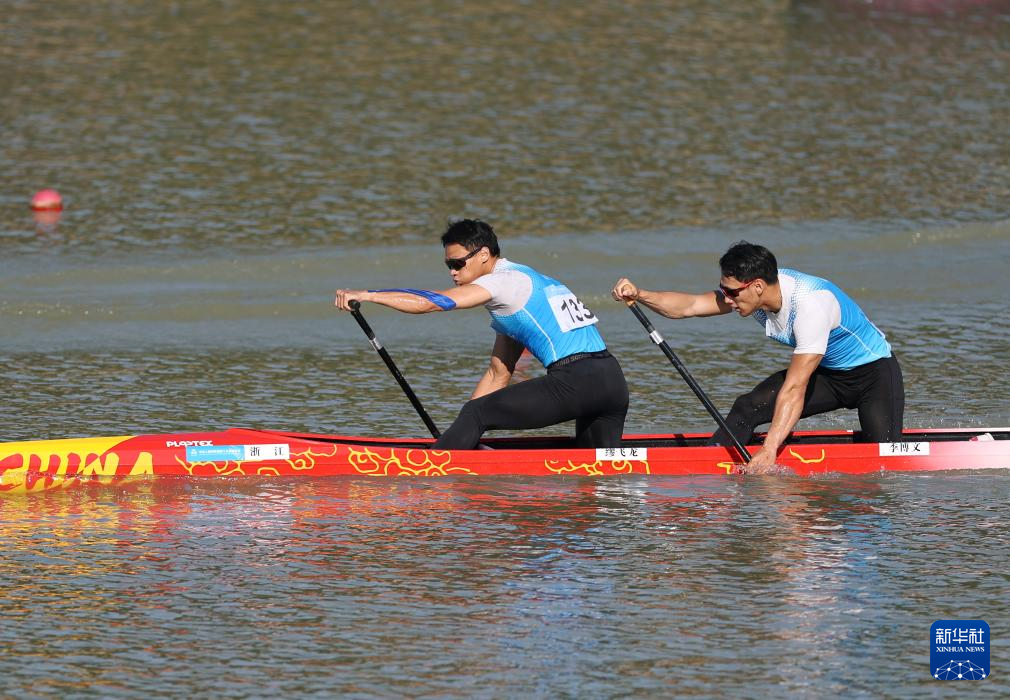 11月17日,浙江队选手缪飞龙(左)/季博文在男子500米双人划艇决赛A中。最终,他们获得亚军。