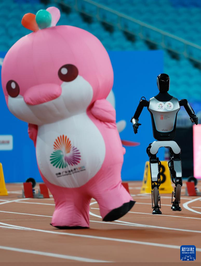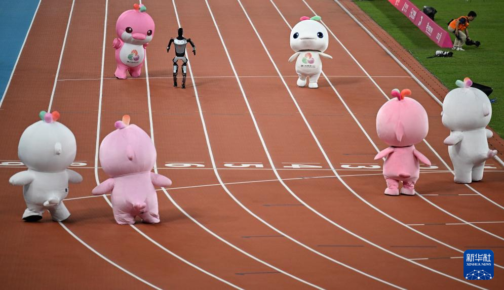 11月17日,在田径项目赛事开始前的暖场活动中,机器人和吉祥物乐融融在广东奥体中心体育场赛跑。