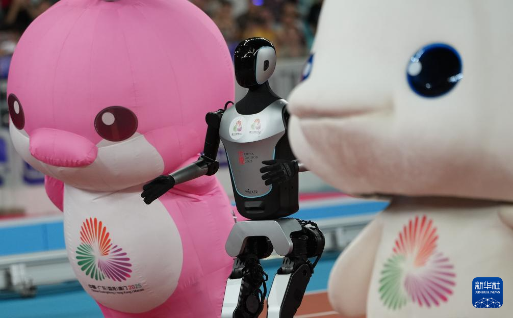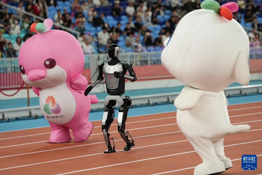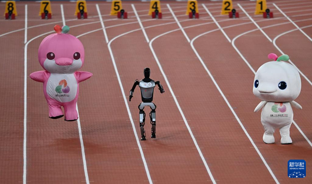 11月17日,在田径项目赛事开始前的暖场活动中,机器人和吉祥物喜洋洋、乐融融在广东奥体中心体育场赛跑。