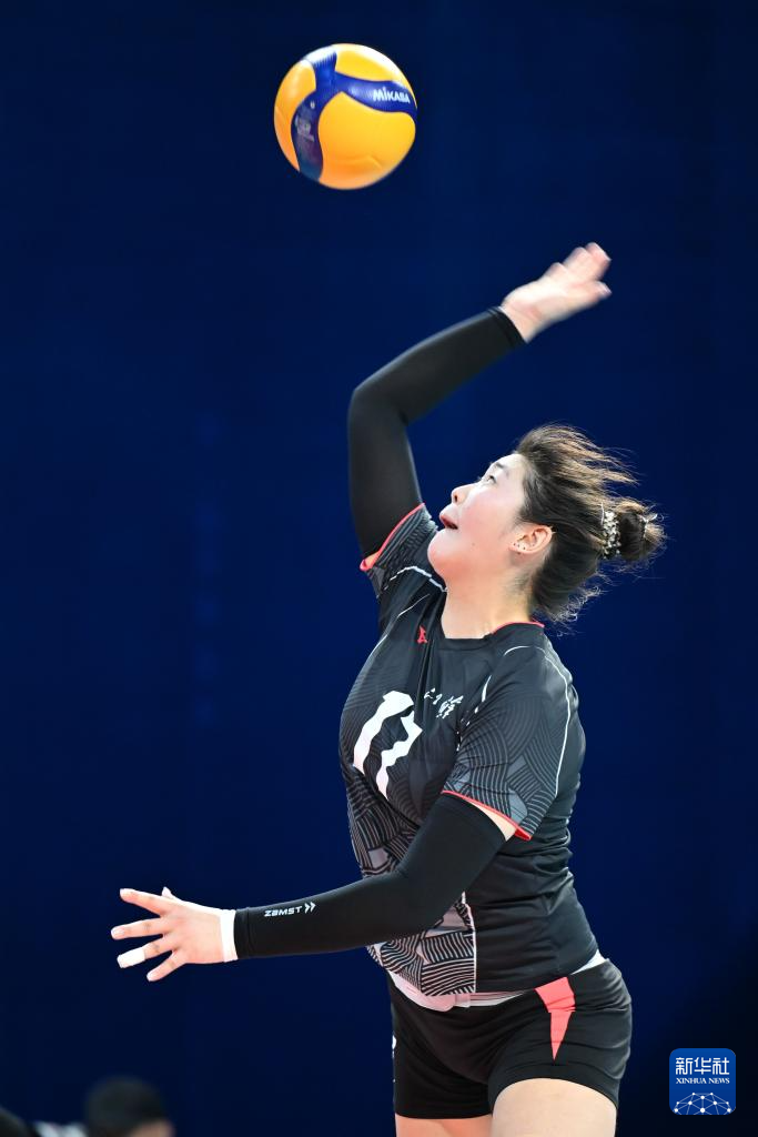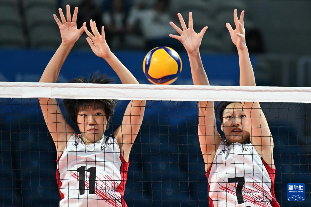 11月17日,河北队球员王馨语(右)在比赛中扣球。