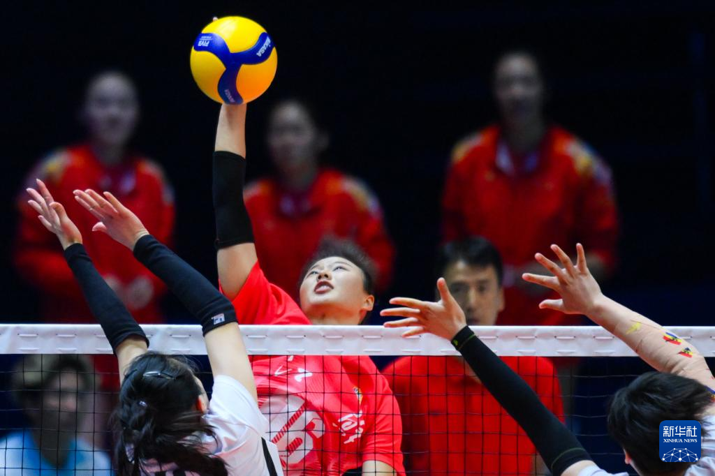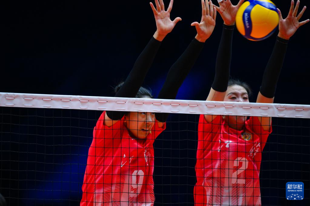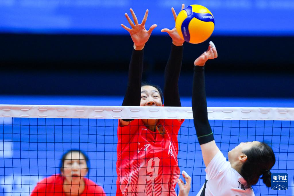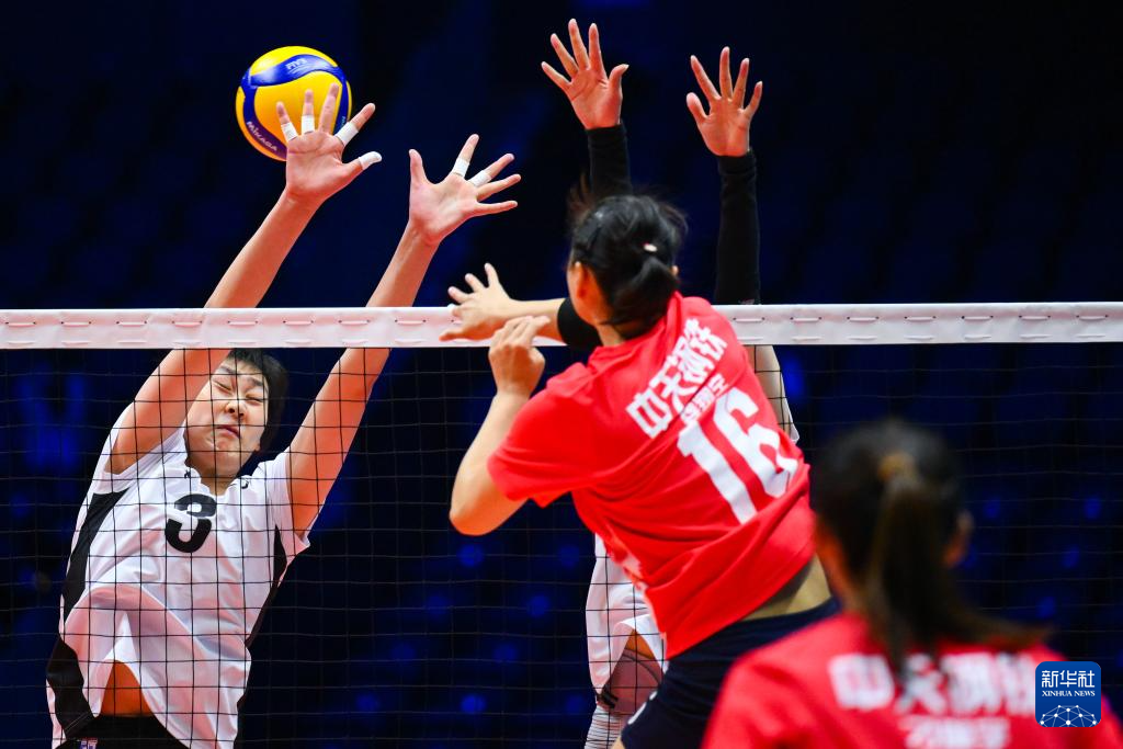 11月17日,江苏队球员万梓玥(中)在比赛中拦网。