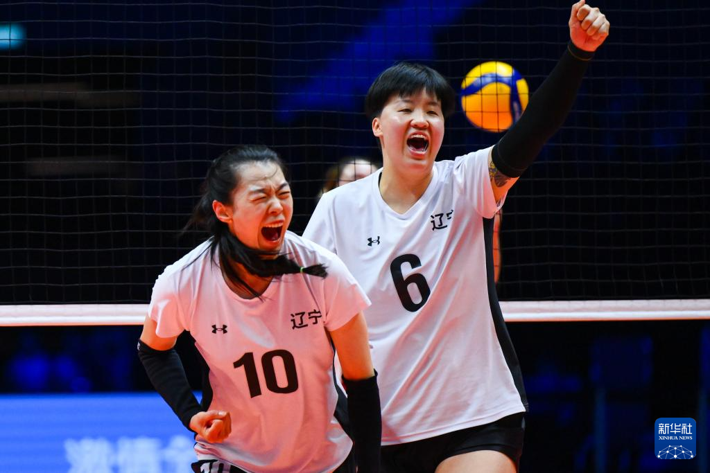 11月17日,辽宁队球员段放(左)、胡铭媛在比赛中庆祝得分。