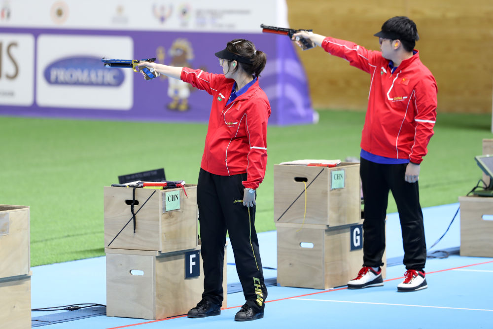 11月11日,在埃及开罗举行的2025年步手枪射击世锦赛10米气手枪混合团体决赛中,中国组合姚千寻(左)/胡凯获得冠军。新华社记者 隋先凯 摄