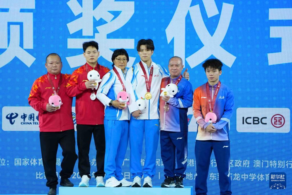 11月17日,冠军浙江队选手陈戬(右三)、亚军重庆队选手程俊(左二)、季军广西队选手钟远龙(右一)在颁奖仪式上和教练合影。