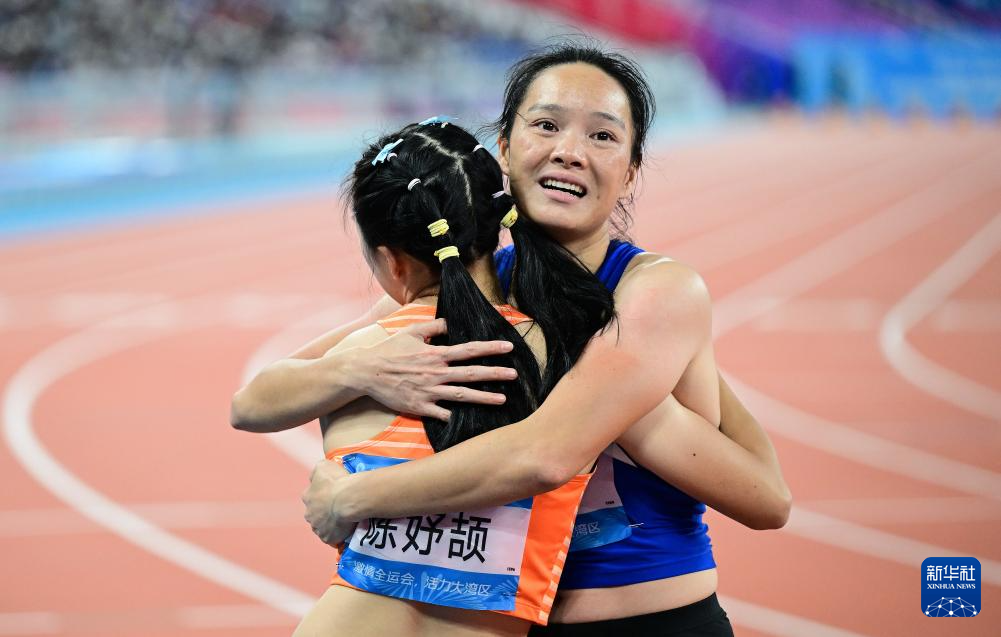 11月17日,浙江队选手陈妤颉(左)和广西队选手韦永丽在赛后拥抱。她们分获冠军和亚军。