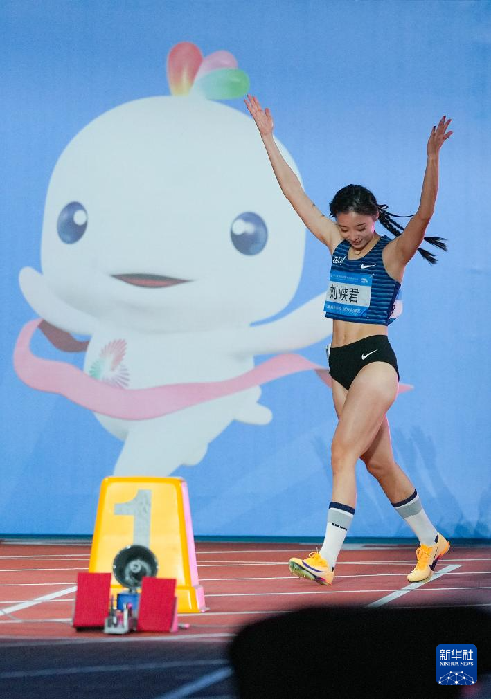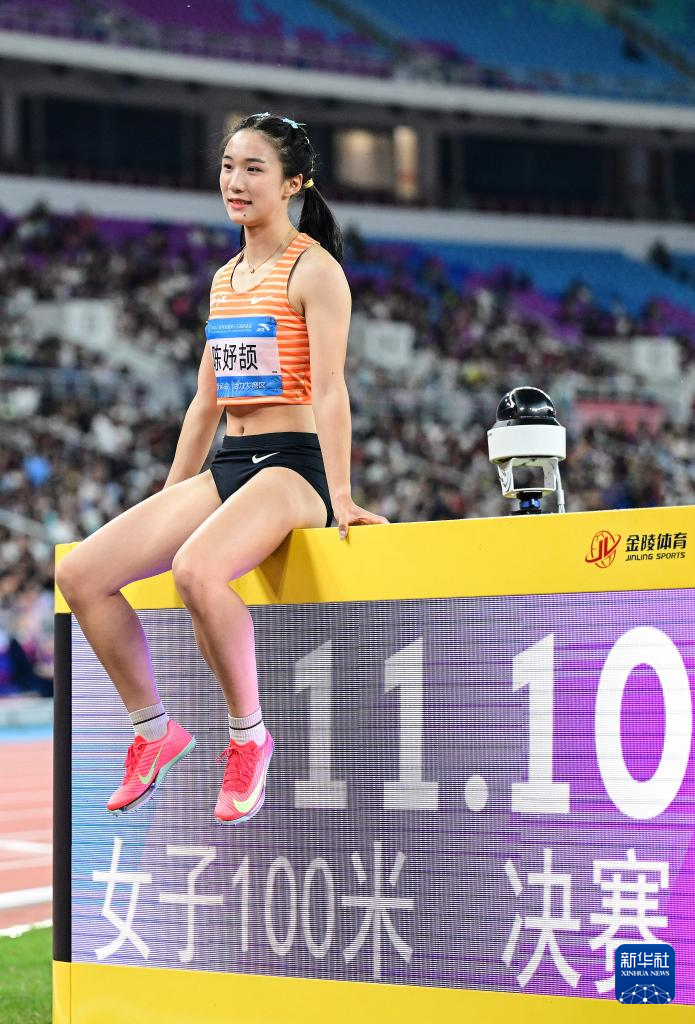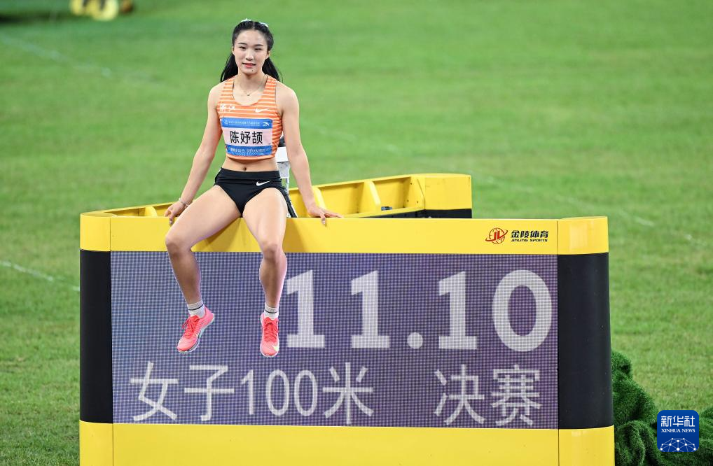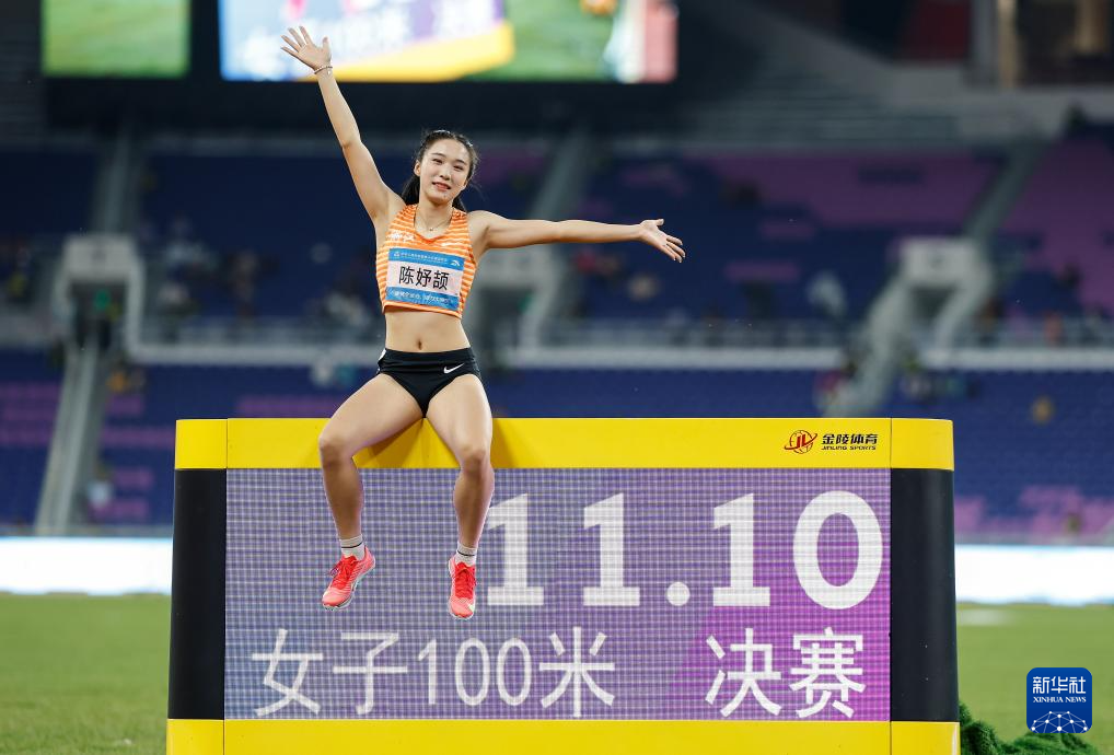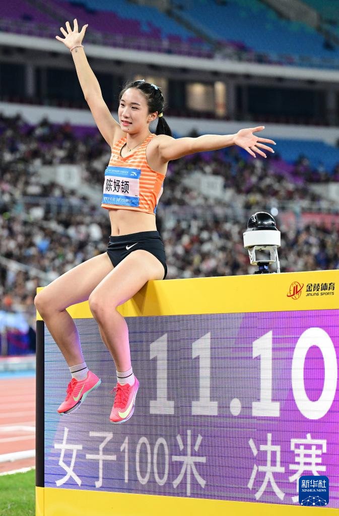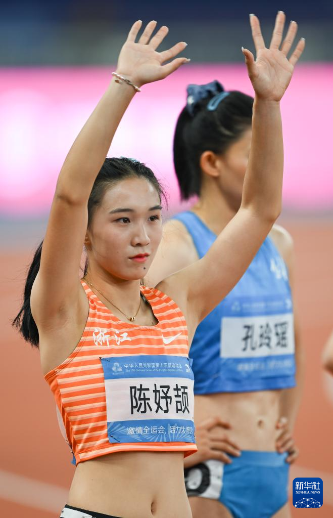 11月17日,浙江队选手陈妤颉在比赛前向观众致意。最终她以11秒10的成绩夺得冠军。
