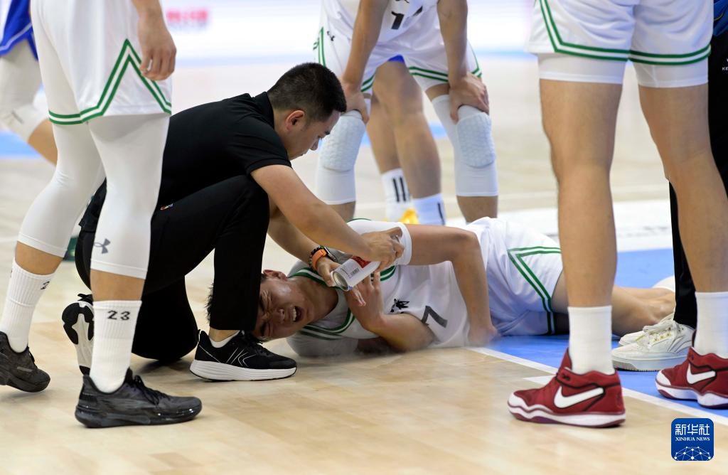 11月17日,辽宁队球员何佳轩(下)受伤倒地接受队医治疗。