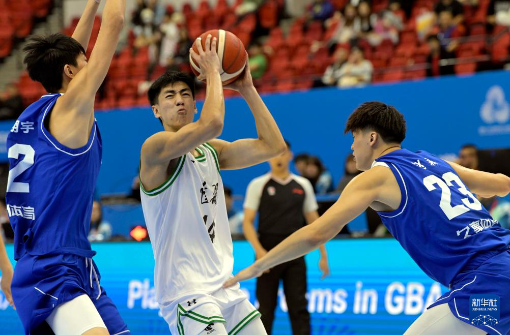 11月17日,上海队球员刘梓鹏(中)在比赛中上篮。