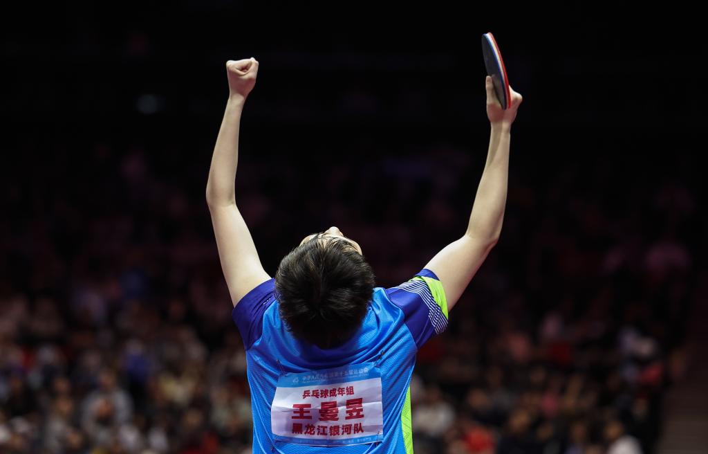 11月16日,黑龙江队选手王曼昱庆祝获胜。新华社记者 陈斌 摄