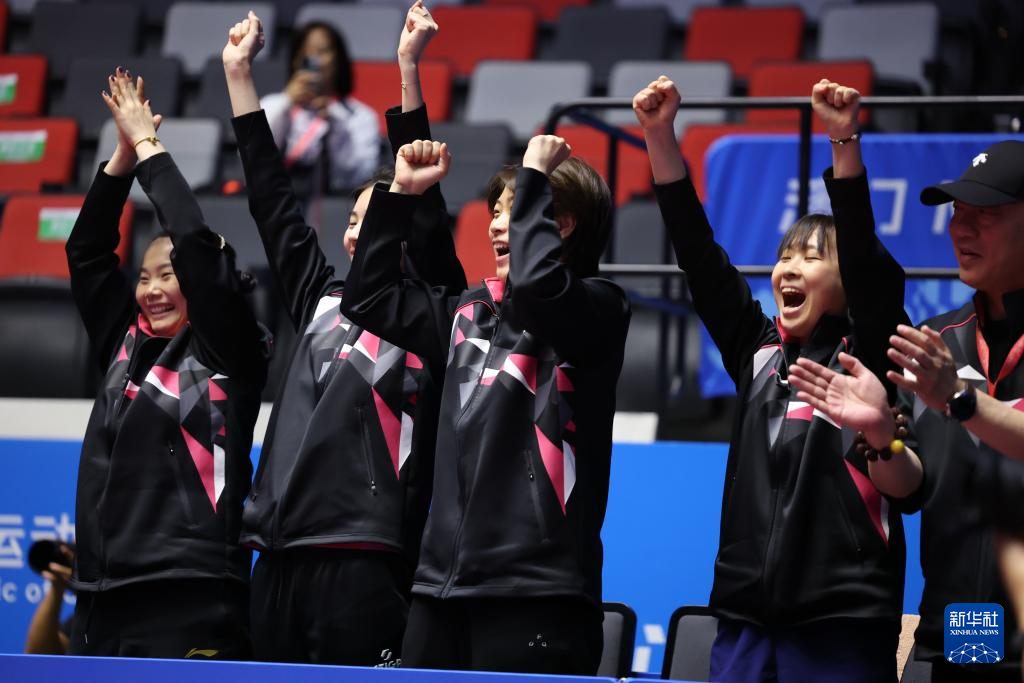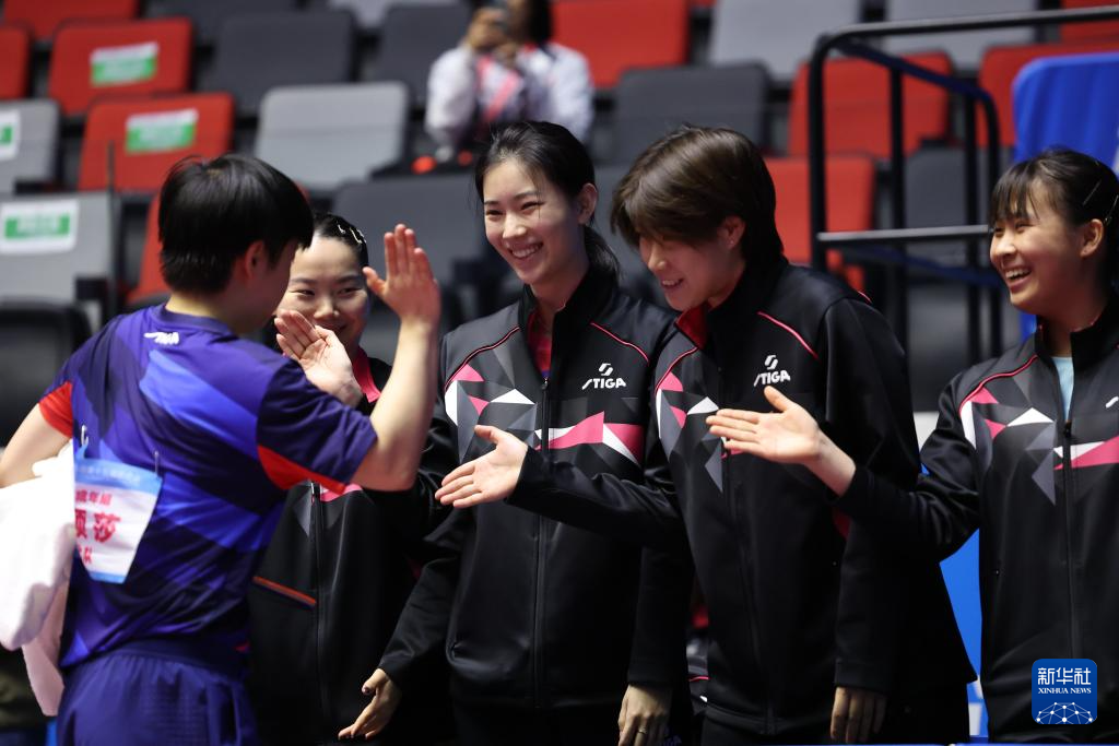 11月18日,河北队选手孙颖莎(前左)在比赛后与队友庆祝,她在单打比赛中3比0战胜辽宁队选手陈幸同。